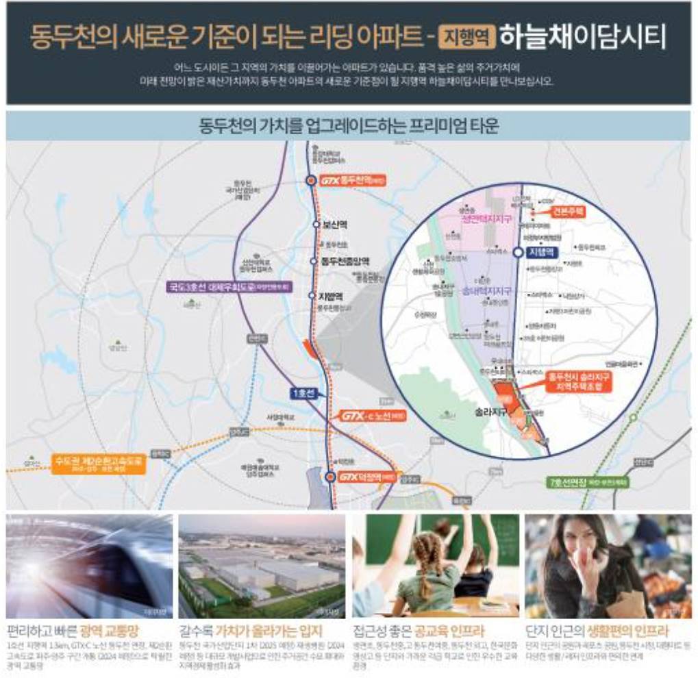 지행역 도보권의 압도적 입지 1호선 지행역을 바로 누리는 동두천 최고의 교통 요충지 지행역 초역세권 단지로서 서울 및 의정부 방면으로의 빠른 출퇴근과 원활한 이동이 가능한 최고의 주거 입지를 자랑합니다. 단지 내 풍부한 시설과 설계 총 400여 세대 이상의 규모와 중앙광장, 산책로, 놀이터의 조화 단지 내 중앙광장과 쾌적한 산책로, 어린이 놀이터 등 3가지 이상의 필수 단지 구성을 통해 여유로운 일상을 선사합니다. GTX-C 노선 연장의 미래 수혜 덕정역과 인접하여 더욱 빨라질 강남 및 수도권 접근성 인근 덕정역에 예정된 GTX-C 노선의 직접적인 영향권으로 향후 광역 교통망 확충에 따른 높은 프리미엄 가치를 선점할 수 있습니다. 롯데마트와 중심상권을 품은 완벽 생활 대형 마트와 각종 편의시설이 밀집한 중심 생활 인프라 단지 주변의 롯데마트, 은행, 병원 등 풍부한 도심 인프라를 걸어서 누리는 원스톱 라이프를 제공합니다. 지행초와 중고교가 인접한 안심 학군 자녀의 안전한 통학이 보장되는 우수한 교육 환경 지행초등학교를 포함한 다수의 학교가 단지와 인접하여 어린 자녀부터 청소년까지 안심하고 통학할 수 있는 학세권을 갖추었습니다. 쾌적한 숲세권과 공원이 주는 힐링 단지 뒤편의 녹지와 공원이 어우러진 자연 친화적 주거 도심의 편리함과 자연의 쾌적함을 동시에 누리는 단지 설계로 사계절 내내 깨끗한 공기와 휴식 공간을 만끽할 수 있습니다. 신뢰의 벽산블루밍 브랜드 프리미엄 오랜 시간 검증된 주거 브랜드가 선사하는 자부심 벽산건설만의 특화 설계와 견고한 시공이 적용되어 지행동을 대표하는 랜드마크 아파트로서의 가치를 이어갑니다.